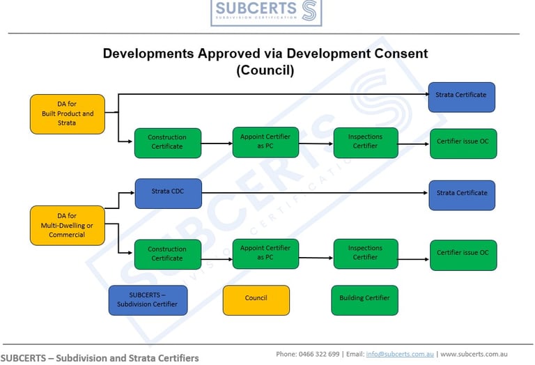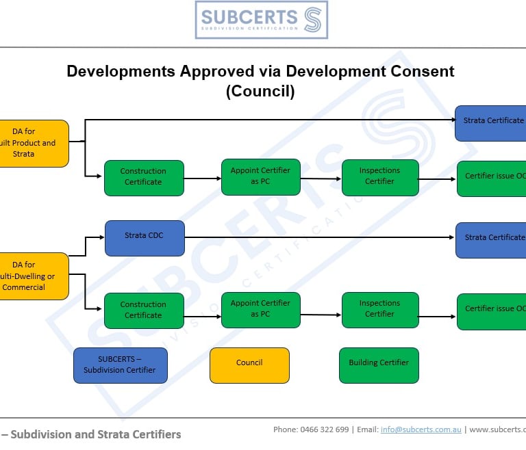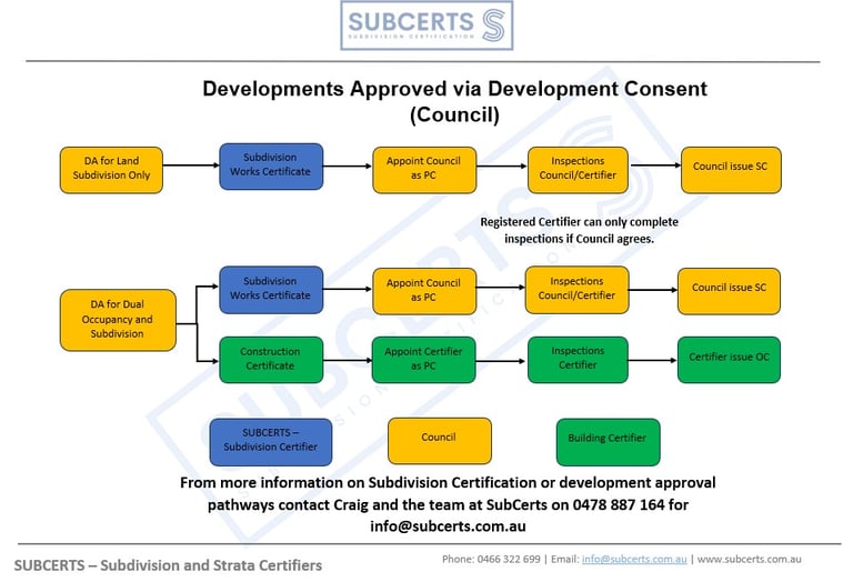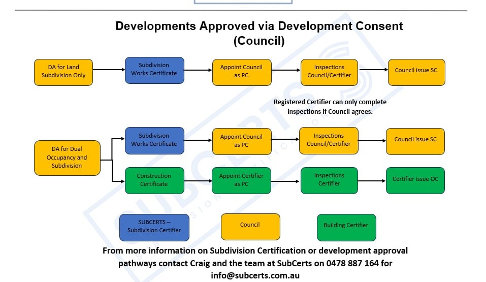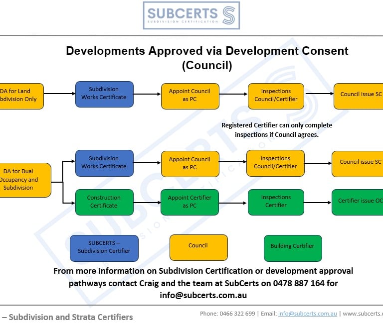 This isnt the case for subdivision, as your may wish to use a Registered Subdivision Certifier to issue your Subdivision Works Certificate, however if your development includes subdivision, specifically either Torrens title or Stratum title, then you are required to go back to Council to obtain your Subdivision Certificate. A Registered Subdivision Certifier can not issue a subdivision certificate for a development consent, or DA, that includes either Torrens or Stratum Subdivision.